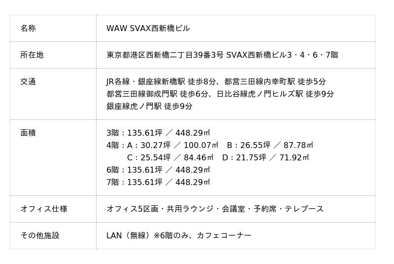 "WORK AND WONDER"をカタチにする会員制シェアオフィス 第9弾『WAW SVAX西新橋ビル』3月1日オープン