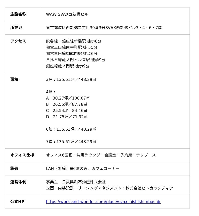 虎ノ門・霞が関に隣接し、ビジネスの実務エリアとして人気の西新橋に、日鉄興和不動産株式会社が展開する会員制シェアオフィス事業の第9弾となる『WAW SVAX西新橋ビル』が、2026年3月1日オープンしたことをお知らせいたします。