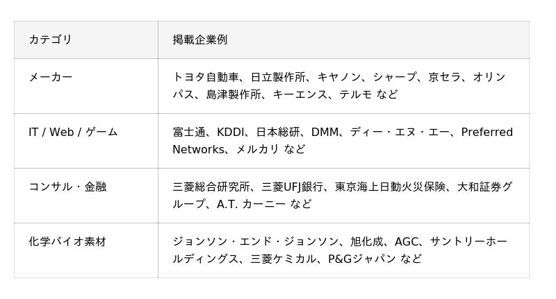 - メーカー- IT / Web / ゲーム- コンサル・金融- 化学バイオ素材