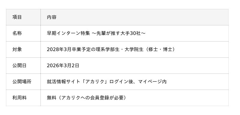 博士人材をはじめとする大学院生・研究者のキャリア支援を行う株式会社アカリク(本社:東京都渋谷区、代表取締役:山田 諒)は、2028年卒業予定の理系学部生・大学院生(以下、理系学生)を対象としたスカウト・求人サイト「アカリク」にて、「早期インターン特集 ~先輩が推す大手30社~」を2026年3月2日に公開いたしました。
