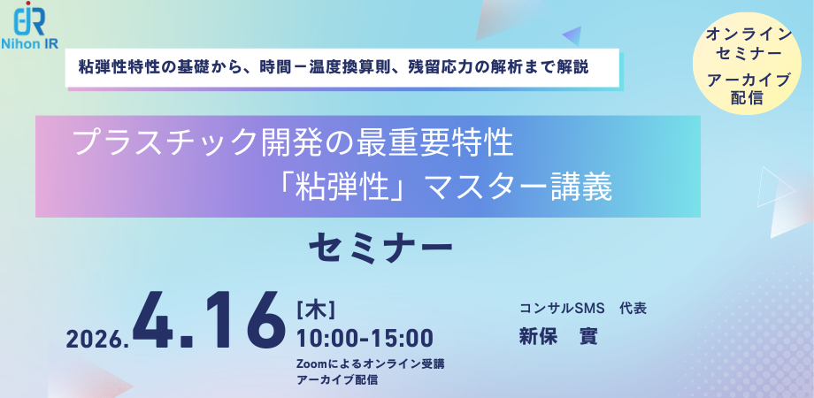 - セミナー名:プラスチック開発の最重要特性「粘弾性」マスター講義- 形式:オンライン(Zoom LIVE配信 / アーカイブ配信)- 開催日時:【LIVE配信】2026/4/16(木)10:00~15:00【アーカイブ配信】2026/4/20~5/6- 受講料:39,600円 / 1名(税込)(複数名受講割引あり)- 講師:新保 實 講師 (コンサルSMS 代表)