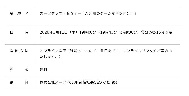 当社では、2026年3月11日(水)19時から、当社代表の小松が講師を務めるスーツアップ・セミナー「AI活用のチームマネジメント」を無料開催します。