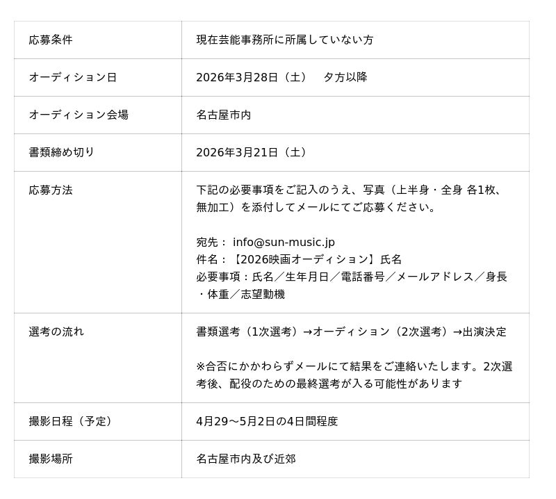 また、本作への出演者を広く募集するオーディションを令和8年3月28日(土)に開催します。