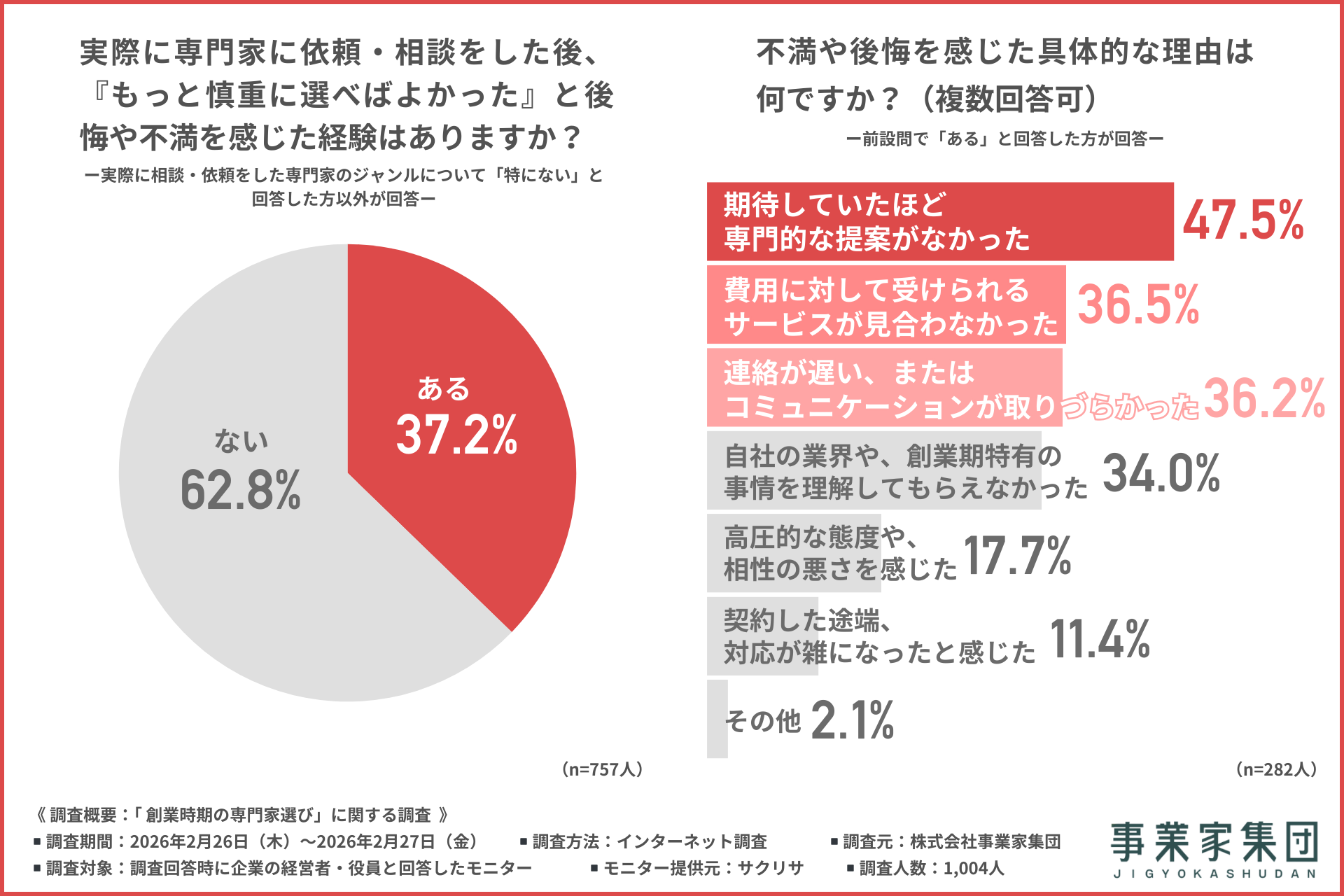 次に「実際に専門家に依頼・相談をした後、『もっと慎重に選べばよかった』と後悔や不満を感じた経験」について尋ねたところ、『ある(37.2%)』『ない(62.8%)』と続きました。