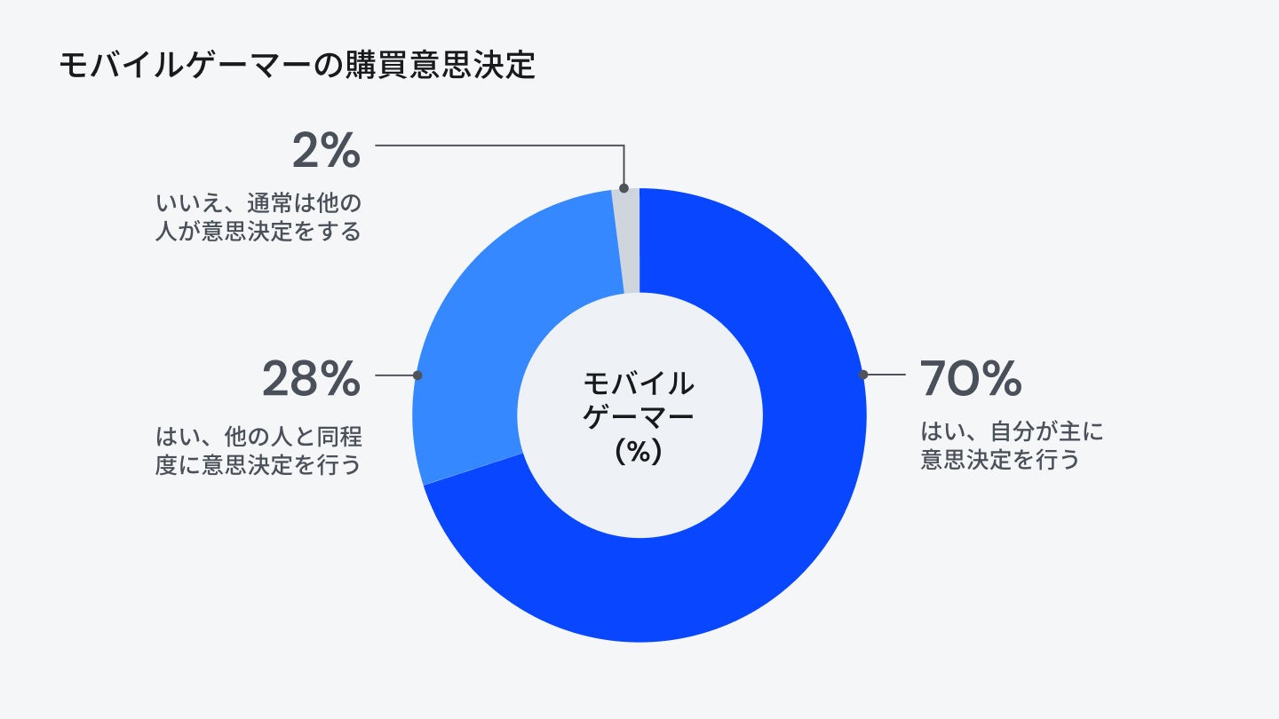 調査によると、モバイルゲームユーザーは世帯内での意思決定に影響力を持つ存在であり、高い購買力を有しています。回答者の70%が「購買決定の大半を自分が行っている」と回答し、また経済的に余裕があると感じていると答えました。
