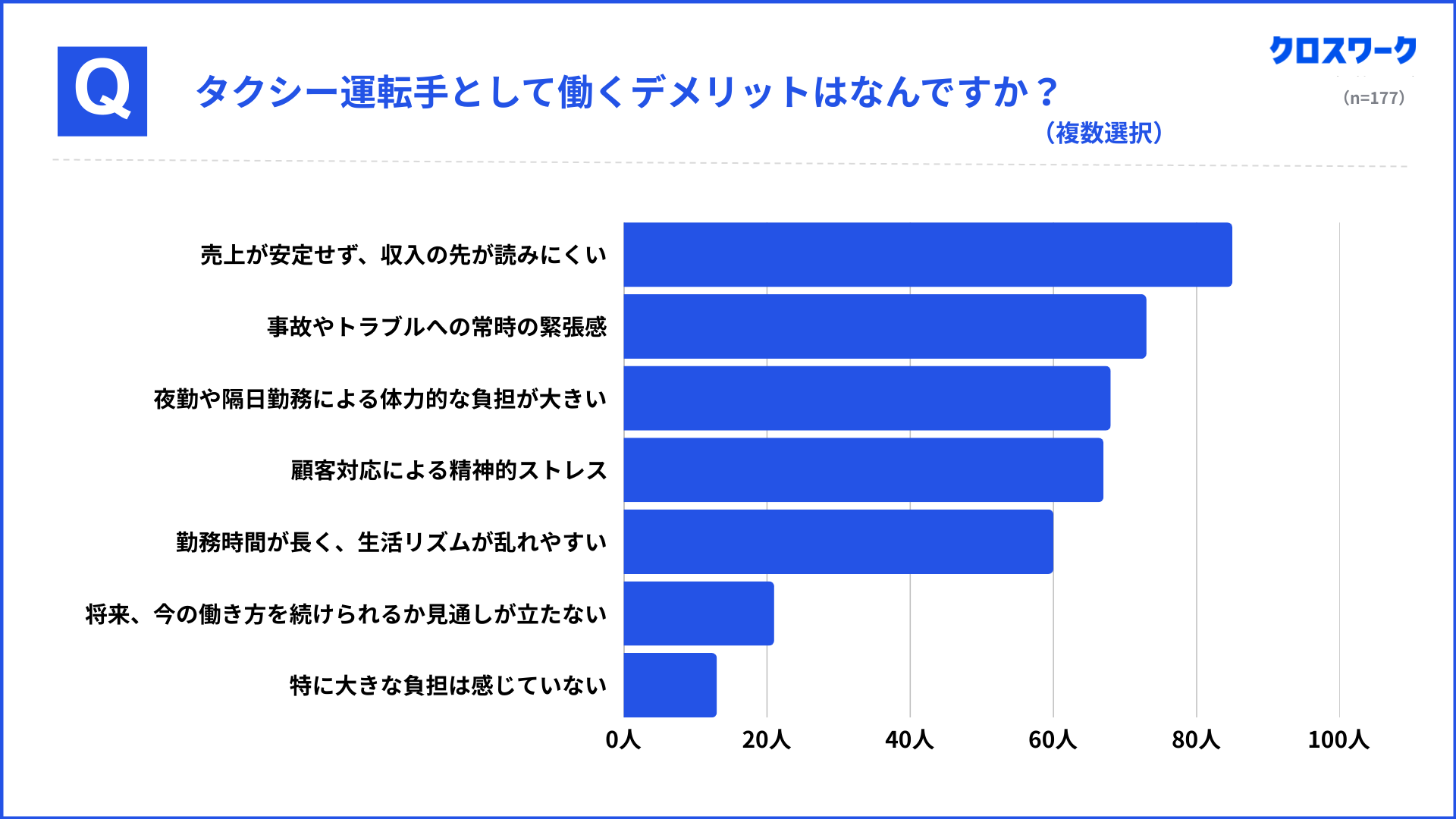 一方で、デメリットについては「売上が安定せず、収入の先が読みにくい」(85名、48.0%)が最多となりました。次いで、「事故やトラブルへの常時の緊張感」(73名、41.2%)、「夜勤や隔日勤務による体力的な負担」(68名、38.4%)、「顧客対応による精神的ストレス」(67名、37.9%)、「勤務時間が長く、生活リズムが乱れやすい」(60名、33.9%)が挙がっています。