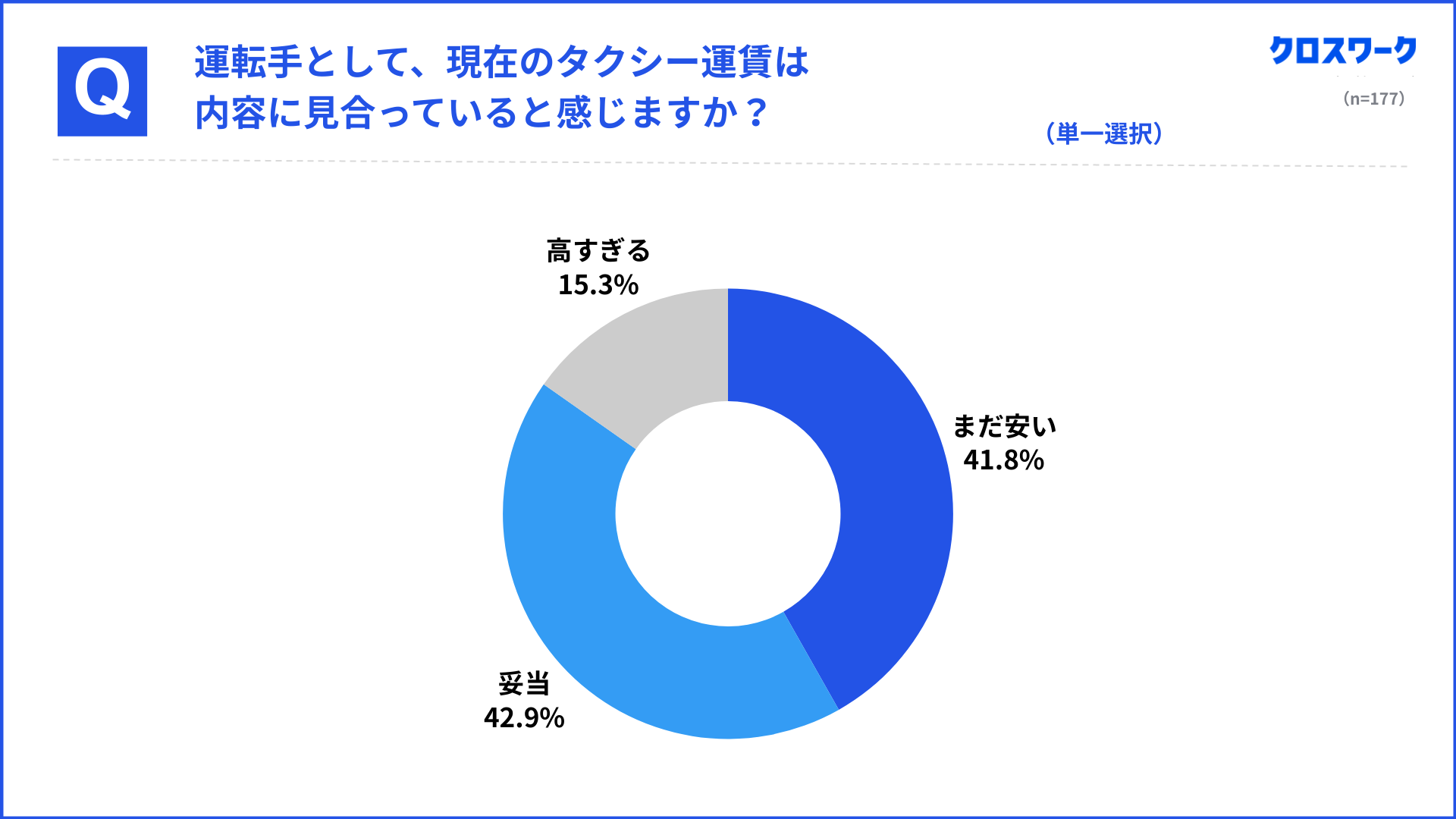 一方で運賃の値上げについて、「高すぎる(これ以上高くなると、お客さんが離れてしまいそう)」(27名、15.3%)と回答したドライバーも15.3%存在しました。