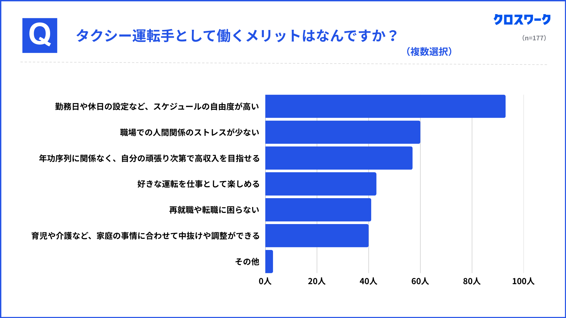 タクシー運転手として働くメリットを聞いたところ、最多は「スケジュールの自由度が高い」(93名、52.5%)でした。人間関係のストレスの少なさ(60名、33.9%)や、成果次第で収入を伸ばせる点(57名、32.2%)も上位に挙がっており、裁量の大きさが魅力として認識されている様子がうかがえます。