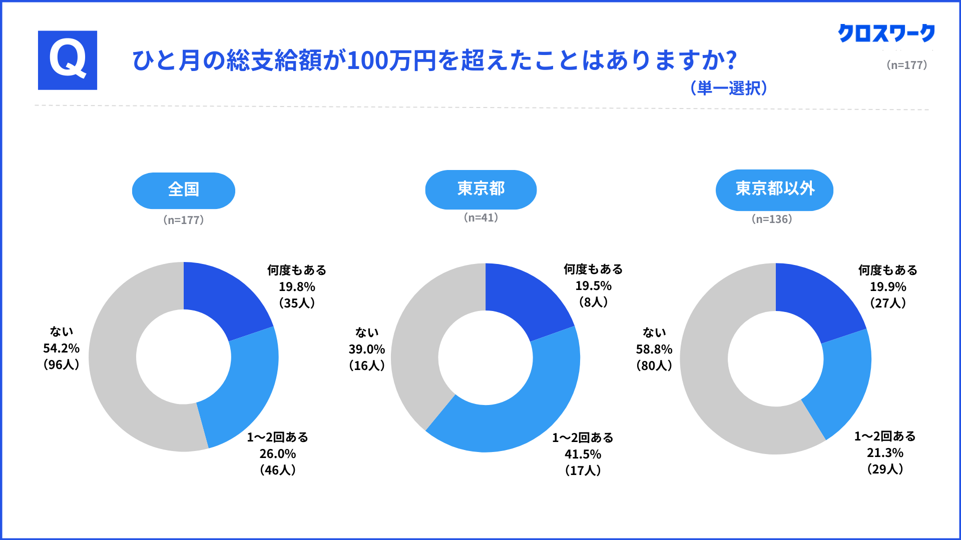 月収100万円を超えた経験があるか聞いたところ、全体の19.8%(35名)が「何度もある」、約26.0%(46名)が「1~2回ある」と回答。全国合計で45.8%(81名)のタクシー運転手が、月収100万円の大台に到達した経験があることがわかりました。