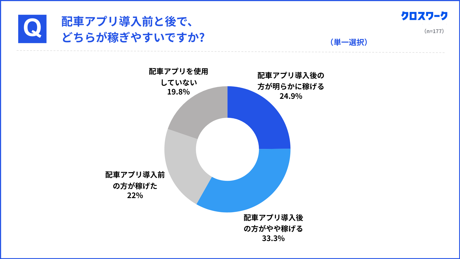 収入環境の変化について尋ねたところ、配車アプリ導入後に「明らかに稼げるようになった」(44名、24.9%)、「やや稼げるようになった」(59名、33.3%)と回答し、合わせて約58%が収益面での変化を実感していることが分かりました。
