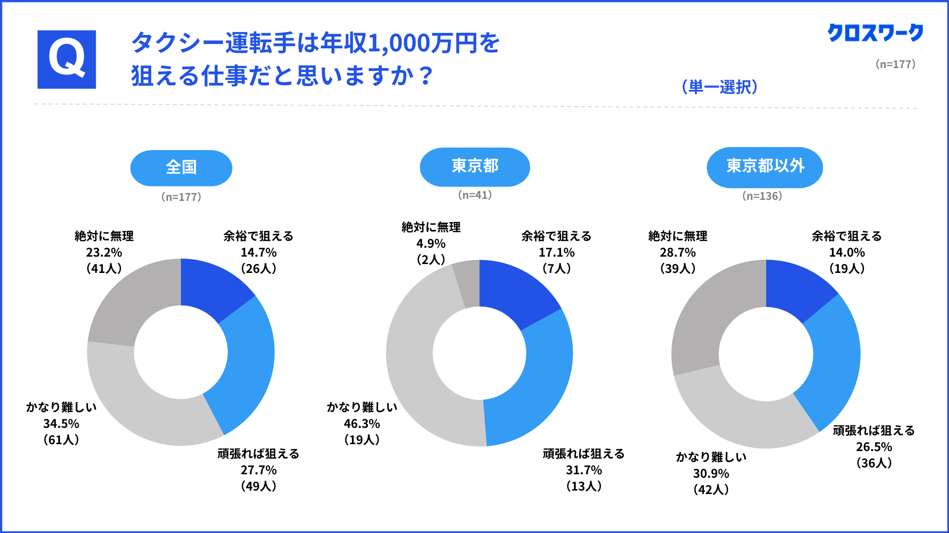 【タクシー運転手】東京では約61%が月収100万円到達経験あり、約5割が年収1,000万円を狙える職業と回答。一方、全国的には約7割が月収40万円以下。ブルーカラービリオネア最前線の働き方177名調査