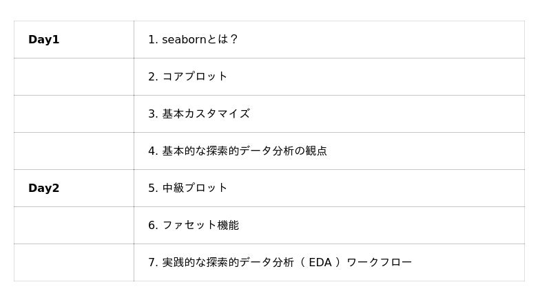 本講座は、seabornを使った探索的データ分析( Exploratory Data Analysis : EDA )の基本を理解することを目的とします。 「なぜこの図を描くのか」 「どのような数学的意味があるか」 「どのような場面で使うか」 この3つを軸として業務に活かせるデータ分析の基礎を学んでいきます。単に数値を集計したり可視化するのではなく、問いに答えることを目的とした可視化や集計のスキル習得を目指します。