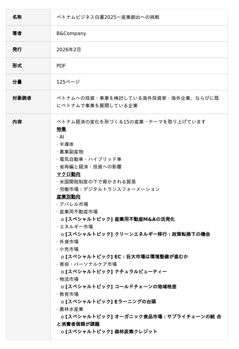 B&Company株式会社(本社:東京都千代田区、代表取締役:太田薫正)は、「ベトナムビジネス白書2025―産業創出への挑戦」の提供を開始しました。本書は約125ページで構成されており、海外から参入する企業がベトナムの現地市場をより深く理解し、同国におけるビジネス機会を探索する一助となることを目的としています。