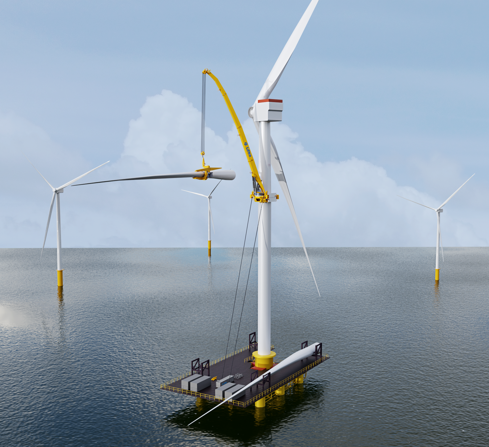 - 希少なジャッキアップ船依存を低減: 主要部品交換は、限られた世界的ジャッキアップ船能力を巡って競合するのではなく、専用プラットフォームとクレーンによる方式で計画が可能。- 運転費用の低減とLCOEの改善:標準的なタグボートで動員できる小型で低 CAPEX のプラットフォームを用いることで、物流を簡素化し、高い日当と長いリードタイムに伴うコスト変動を抑えることができる。- 最も費用負担が大きい保守イベントのリスクを軽減:複雑な船舶キャンペーンを削減し、重量物揚重への依存を低減することで、ダウンタイム、保証紛争、保険・金融コストを増大させるスケジュールおよび気象リスクの緩和が可能となる(案件により影響度は異なる)。- 海底への接触や水深による制約条件なしに運用が可能:より深い水深域や浮体式プロジェクトへの注力を強める日本にとって極めて重要な優位性。- 環境への負荷軽減: 大型洋上船に比べて動員時の排出量が低く、現場では小規模な作業フットプリントで運用できる。また、Liftra社 のセルフホイスティングクレーンはバッテリー駆動。