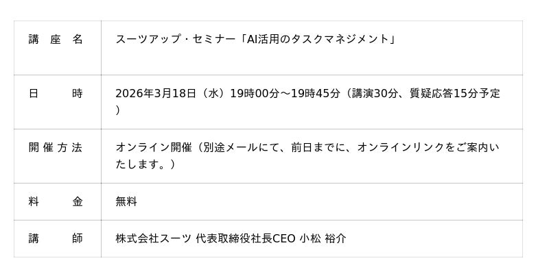 当社では、2026年3月18日(水)19時から、当社代表の小松が講師を務めるスーツアップ・セミナー「AI活用のタスクマネジメント」を無料開催します。