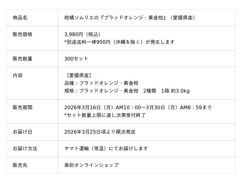 楽彩株式会社(本社:東京都足立区、代表取締役社長:大崎善保)は、2026年3月16日(月)より、愛媛県産の希少な柑橘を贅沢に詰め合わせた「柑橘ソムリエの『ブラッドオレンジ・黄金柑』」の予約販売を開始いたします。柑橘を知り尽くしたスペシャリスト「柑橘ソムリエ」が愛媛の地で丹精込めて育て上げた、産地直送の逸品です。濃厚な甘みとコクが特徴の「ブラッドオレンジ」と、小ぶりながら爽やかな香りと甘さが際立つ「黄金柑」。市場に出回ることが少ない希少な2品種を一度に楽しめる、今だけの特別な食べくらべボックスです。春の陽気にぴったりの、甘酸っぱく贅沢なひとときを全国の食卓へお届けします。