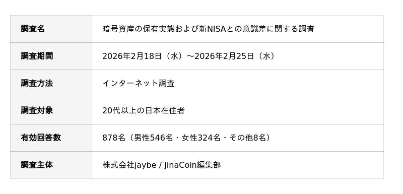 https://jinacoin.ne.jp/)は、20代以上の日本在住者878名を対象に、暗号資産の保有実態および新NISAとの意識差に関するインターネット調査を実施しました。