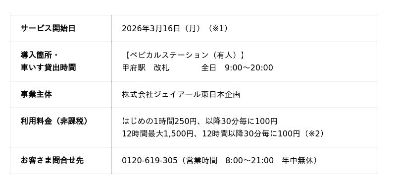 〇山梨県内の駅では初めての導入となります。また、八王子支社管内における「車いすレンタルサービスbyベビカル」の導入駅としては、府中本町駅・国分寺駅に続き3箇所目となります。