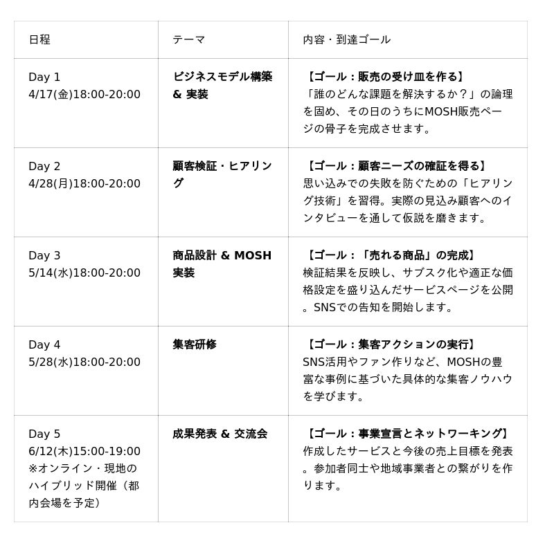 - 【最短での商品化】 初日で「販売ページ」が完成する実践カリキュラムDay1からMOSHのアカウント開設と販売ページの骨子作成に着手。頭で考える時間を最小限にし、まずは形にして世に出す「プロトタイピング」の手法を体得できます。- 【プロによる事業開発研修】 「思い込み」を排除する事業開発「自分よがりな商品」になっていないか? 事業開発のプロフェッショナルであるAlphaDriveのメンバーが顧客ヒアリングの設計から価格設定のロジックまで、ビジネスとして成立させるための研修を行います。- 【仲間との共創】 全国から集まるクリエイターとのコミュニティ同じ志を持つ同期生との相互フィードバックや、過去の成功事例の共有を通じて、一人では得られない視点やモチベーションを獲得できます。