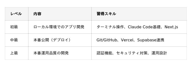 ・到達目標: 要件定義 → 設計 → 開発 → デプロイまでを単独で完結