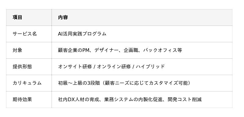 モンスターラボはこの成果を受け、この度顧客企業向けに非エンジニア人材がAIを活用して業務アプリケーションを開発できるよう支援する研修サービス「AI活用実践プログラム」の提供を開始します。