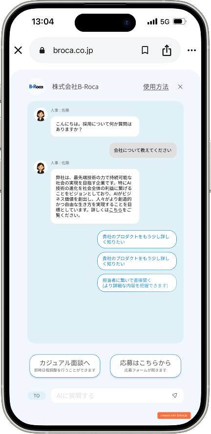 EntryUpは、企業の採用サイトに設置するAIチャットボットです。