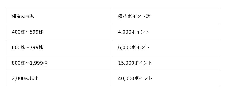 当社の株主優待制度では、3月31日時点の株主名簿に記載または記録されている株主様のうち、保有株式数400株以上の株主様を対象に、保有株式数に応じてポイントを贈呈しております。その他のご利用条件については現在の株主優待制度から変更ございません。