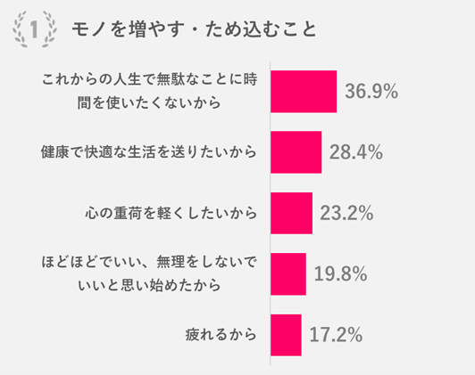 「卒業したいこと」の1位は「モノを増やす・ため込むこと」。60代・70代以上で1位、50代で2位だった。卒業したい理由の1位は「これからの人生で無駄なことに時間を使いたくないから」、2位は「健康で快適な生活を送りたいから」、3位は「心の重荷を軽くしたいから」。