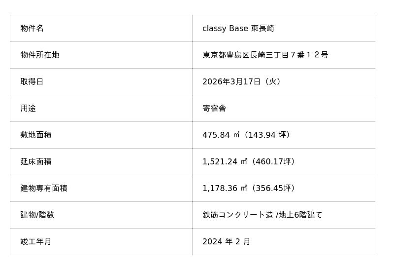 資産の取得に関するお知らせ(学生向け賃貸レジデンス)