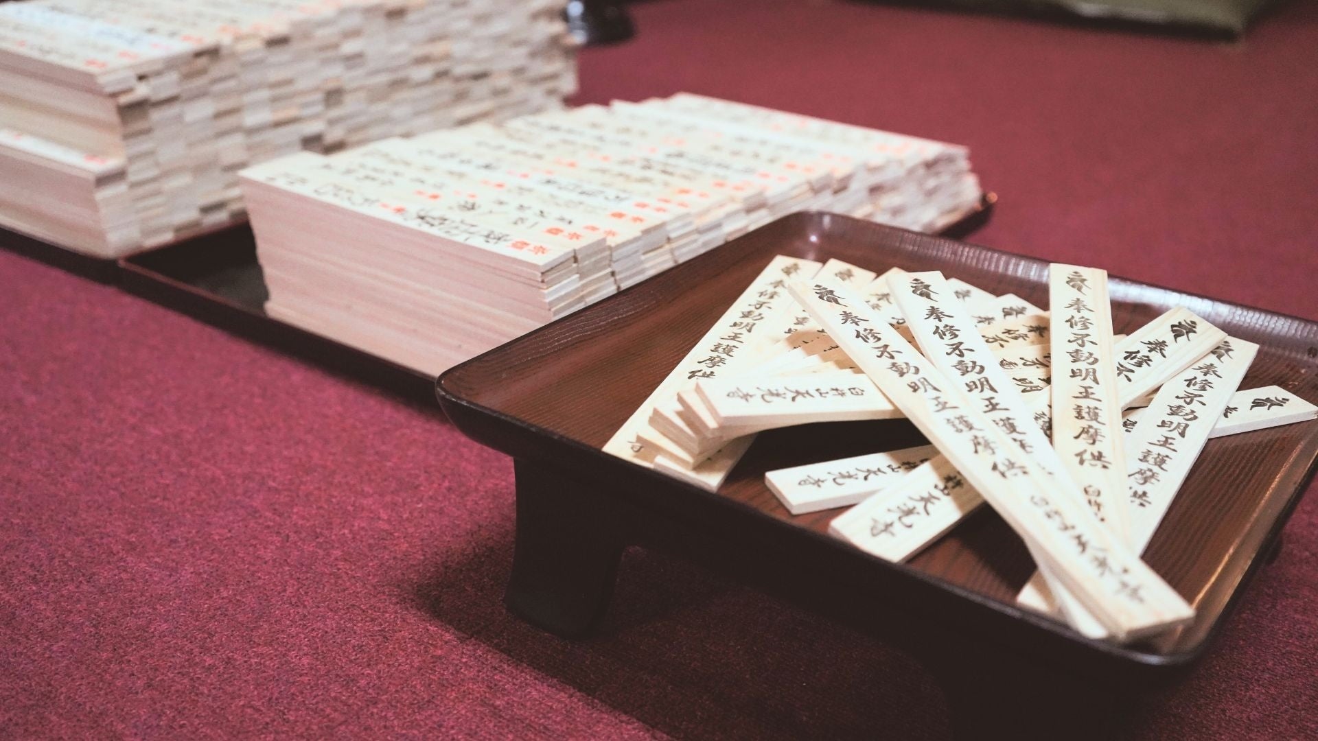 護摩炊きの際に願いや思いを託して焚き上げるための細長い木札のことです。参拝者は家内安全や厄除け、心願成就などの願意を書き込み、住職が読経とともに火中へと投じます。炎は煩悩や穢れを焼き尽くし、願いを清めて仏へ届ける象徴とされます。一本一本に込められた祈りが重なり合い、場全体に荘厳な気配を生み出すのも特徴です。