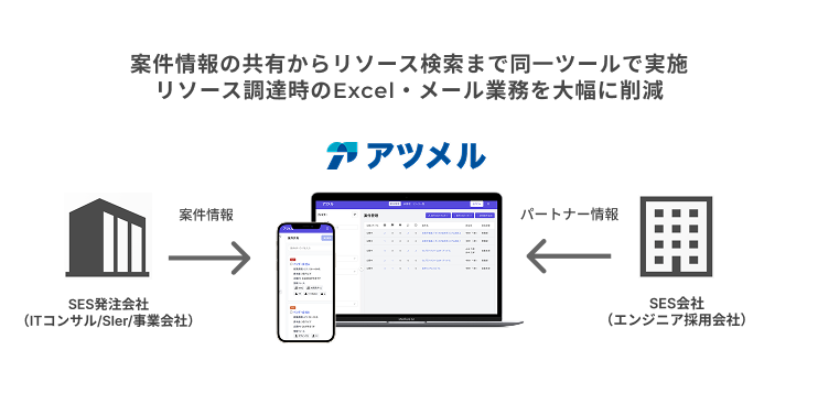 - サービス名: アツメル- 対象: ITコンサルティング企業、SIer、事業会社、SES企業- 主な機能: パートナー企業招待・管理、案件共有、リソース検索、稼働スケジュール管理- お問い合わせ: