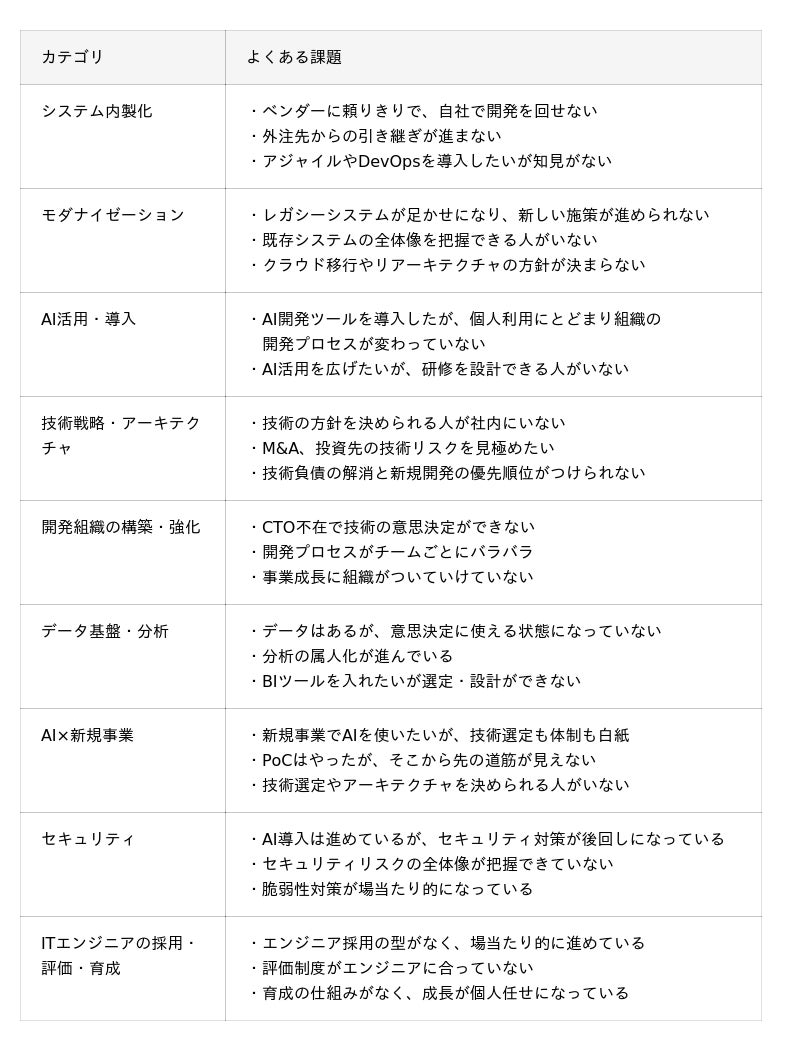 - 大手非鉄金属企業:経営企画向け共通データ基盤の構築に関する助言- 中堅SIer企業:AI駆動開発に向けた組織力の強化- 大手通信企業:AI導入後の組織課題に対して、CTO経験者が技術戦略・組織設計・採用を一気通貫で伴走