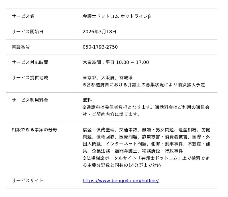 弁護士ドットコム株式会社(東京都港区、代表取締役社長 兼 CEO・弁護士:元榮 太一郎、以下:当社)は、音声AIを活用し電話一本で弁護士探しが可能な「弁護士ドットコム ホットライン(β)」の提供を開始することをお知らせします。