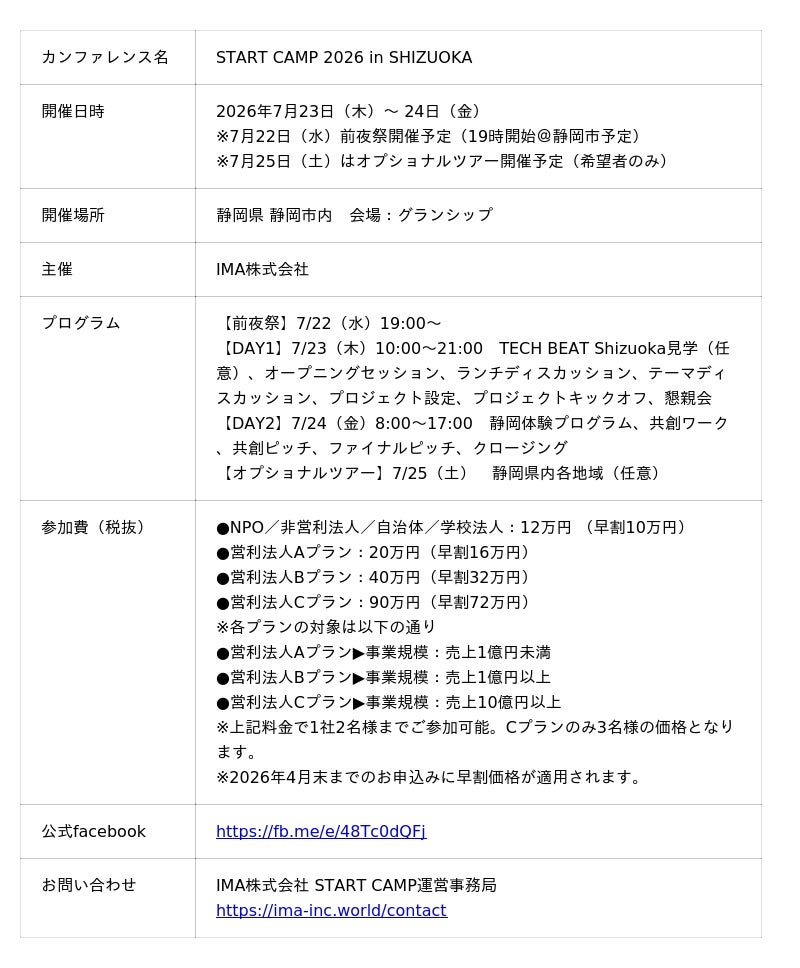 IMA株式会社(代表取締役:海野 慧、以下IMA)は、事業共創カンファレンス「START CAMP 2026 in SHIZUOKA」を、2026年7月23日(木)~24日(金)に静岡県静岡市にて開催することを決定し、共創パートナー及び参加者の募集を開始しました。尚、2026年4月末までに参加企業としてお申込みいただいた場合、早割価格が適用されます。