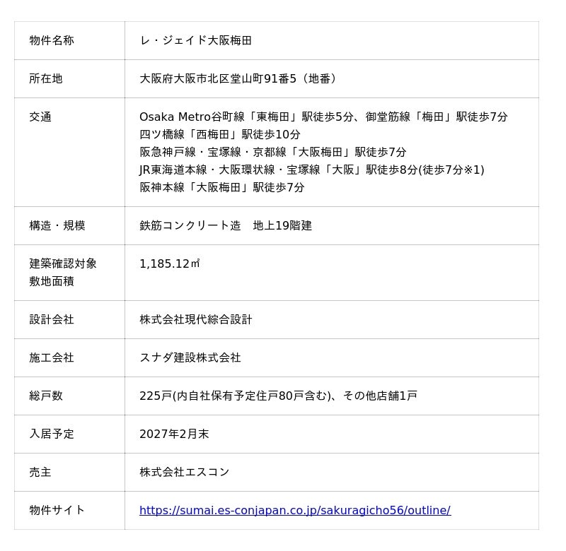 株式会社エスコン(本社:東京都港区、代表取締役社長:伊藤貴俊)が大阪市北区において手がける、新築分譲マンション『レ・ジェイド大阪梅田』につきまして、2026年3月20日(金)より分譲開始いたしますので、お知らせいたします。当物件は、複数の再開発が進行中の「梅田」エリアに誕生し、様々な大型商業施設が身近に揃う、都心の利便性を享受できるレジデンスです。