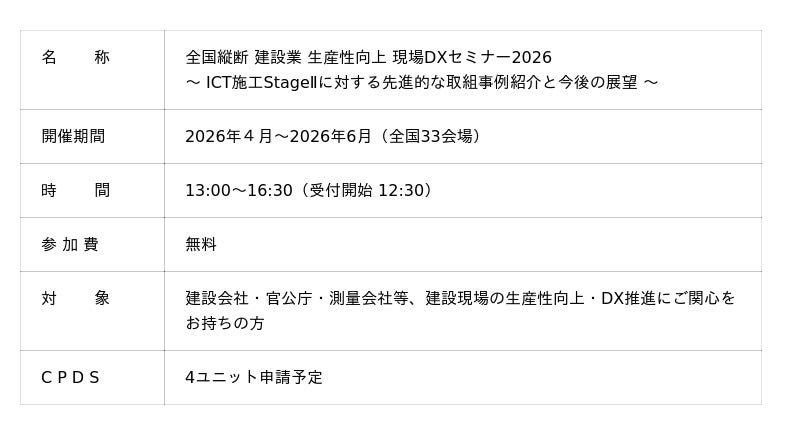 「建設業DX推進の日」に合わせ、全国33会場で無料セミナーを開催 全国縦断 建設業 生産性向上 現場DXセミナー2026~ ICT施工StageIIに対する先進的な取組事例紹介と今後の展望 ~