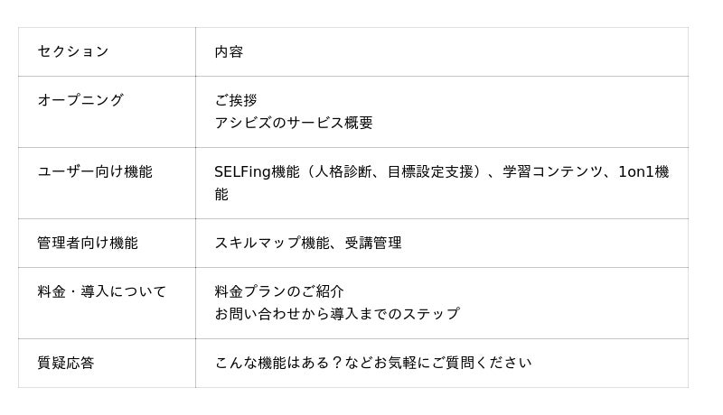 本セミナーでは、アシビズのユーザー向け機能と管理者向け機能を、実際の画面を交えてご紹介します。後半では、料金プランや、導入までの具体的なフローについても解説いたします。