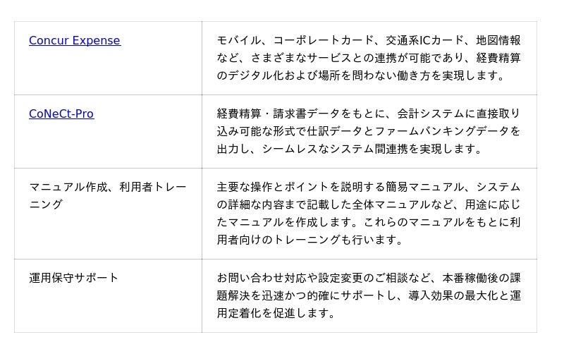 弊社はシステム開発力をベースに、多くのソリューションを企画・展開しております。SAP Concurの導入から運用フェーズに至るまで一貫してサポートし、経費精算業務がより効率的に進むよう伴走いたします。これらの取り組みにより、システムの安定稼働を確保するとともに、さらなる利便性向上を実現し、業務の効率化とガバナンス強化に貢献いたします。