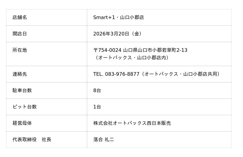 株式会社オートバックスセブン(代表取締役 社長:堀井勇吾)は、クルマのキレイを守る専門店「Smart+1・山口小郡店」を、「オートバックス・山口小郡店」(山口県山口市)内に、2026年3月20日(金)にオープンします。
