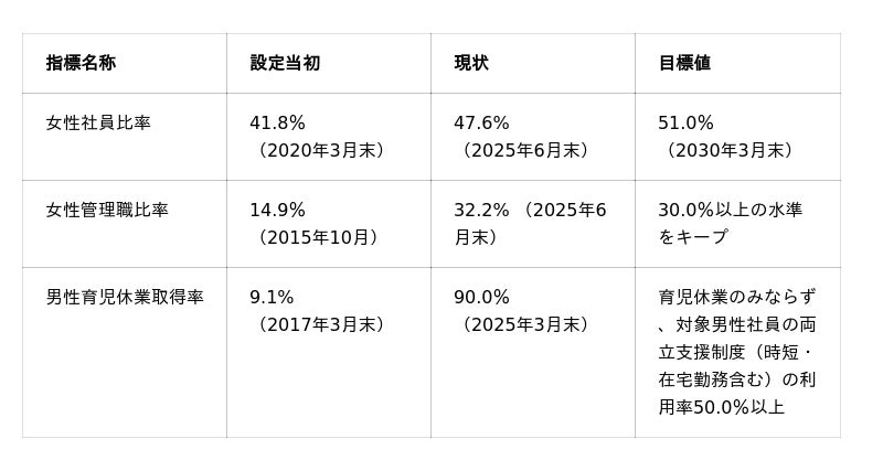 メンバーズでは、優秀なデジタル人材を採用・育成し続け、多様な人材の活躍の場を増やしていくために、「女性社員比率」および「女性管理職比率」を目標指標として設定しています。また、男女ともに長く働きやすい働き方として、子育て社員への勤務時間の短縮や有給の看護休暇などの制度を設けると同時に、「男性育児休業取得率」を目標指標としています。