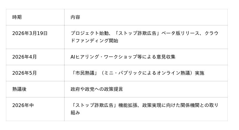 本プロジェクトの実現に向け、DD2030は2026年3月よりクラウドファンディングを開始します(目標金額:500万円)。調達した資金は、ストップ詐欺広告の開発費用、市民熟議の実施費用、および広報・世論喚起活動に充当します。本クラウドファンディングは寄付型であり、リターン品の設定はありません。