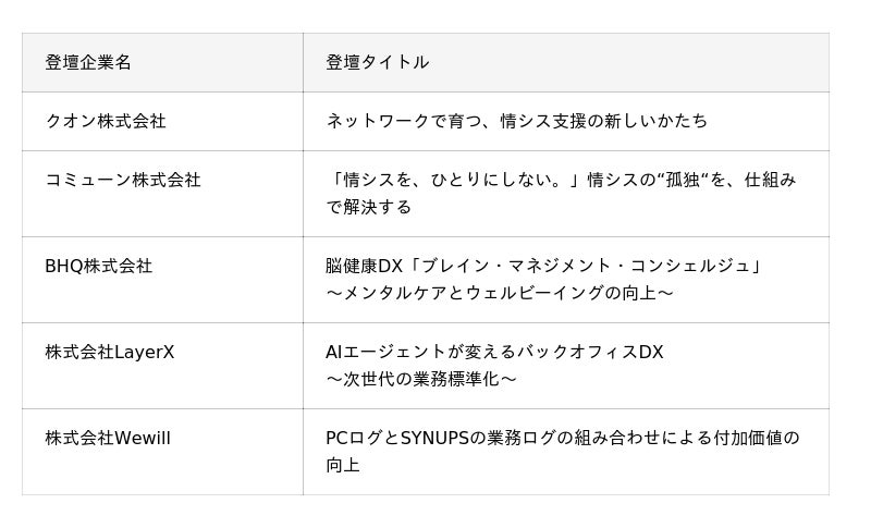 2026年2月17日(火)にNTT西日本が運営するオープンイノベーション施設QUINTBRIDGEにて、書類選考を通過した5社によるピッチ審査を実施しました。厳正な審査の結果、私たちのお客様である情シス担当者同士がつながり合い、NTT西日本とお客様が相互に中堅・中小企業の課題解決と成長に貢献できるプラットフォームへ「情シスおまかせコンシェルジュ」を進化させるため、ともに取り組むパートナーとして下記の企業を採択しました。