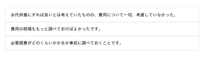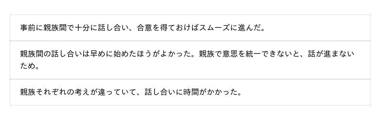 その結果、後悔の声は主に 1.親族との話し合い 2.費用の事前把握 3.代行サービスの活用判断 の3点に集約されました。