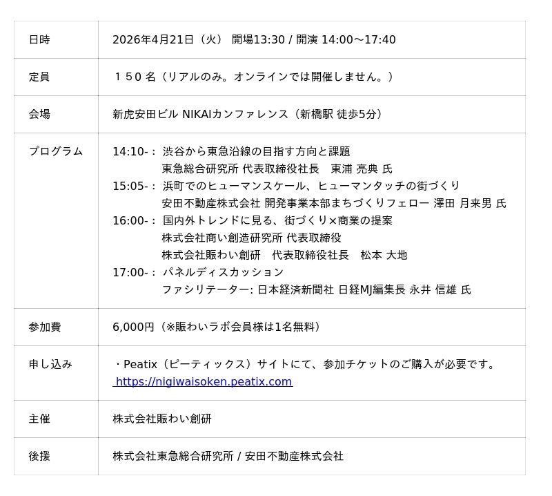 株式会社スコープ(本社:東京都千代田区、代表取締役社長:横山 繁)のグループ会社である株式会社賑わい創研(本社:同上、代表取締役社長:松本 大地)は、2026年4月21日(火)14:00~17:40、新虎安田ビル NIKAIカンファレンスにて、「大変革期における 都市・商業・街づくりの針路 ~革新か停滞か!~」をテーマにしたシンポジウムを開催いたします。