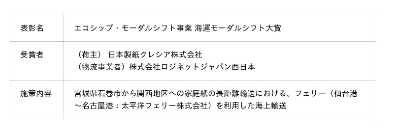 当社グループの株式会社ロジネットジャパン西日本は、日本製紙クレシア株式会社と連携し、「物流の2024年問題」に伴うドライバー不足の深刻化、およびカーボンニュートラル実現に向けた社会的要請に応えるため、陸上輸送から船舶輸送への「モーダルシフト」を推進しました。本施策の導入により、以下の3点において顕著な成果を得たことが評価され、令和7年度「エコシップ・モーダルシフト事業 海運モーダルシフト大賞」を受賞したものです。