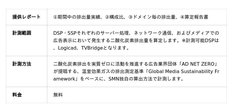 SMN株式会社(本社:東京都品川区、代表取締役 執行役員社長:原山 直樹、以下SMN)は、自社DSP「Logicad」および「TVBridge」における広告配信時に発生する二酸化炭素(CO2)排出量を計測・可視化するオプションサービス「Logicad CO2計測レポート」を、2026年3月23日から提供開始します。本サービスを通じて、環境対策の可視化やサステナブルな企業ブランド構築を支援するとともに、SMN自身も環境配慮を推進し「企業から選ばれる総合デジタルマーケティングテクノロジー企業」を目指します。