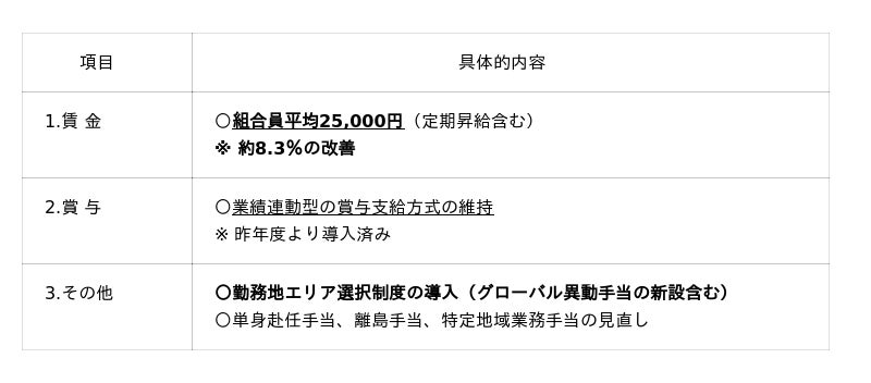 本日の妥結により、組合員平均25,000円(定期昇給含む)の賃金改善を実施いたします。これにより、45歳社員平均で約70万円の年収アップを想定しており、2029年度中期経営 計画のKPI「45歳平均年収1,000万円」を前倒しで達成できる見込みです。