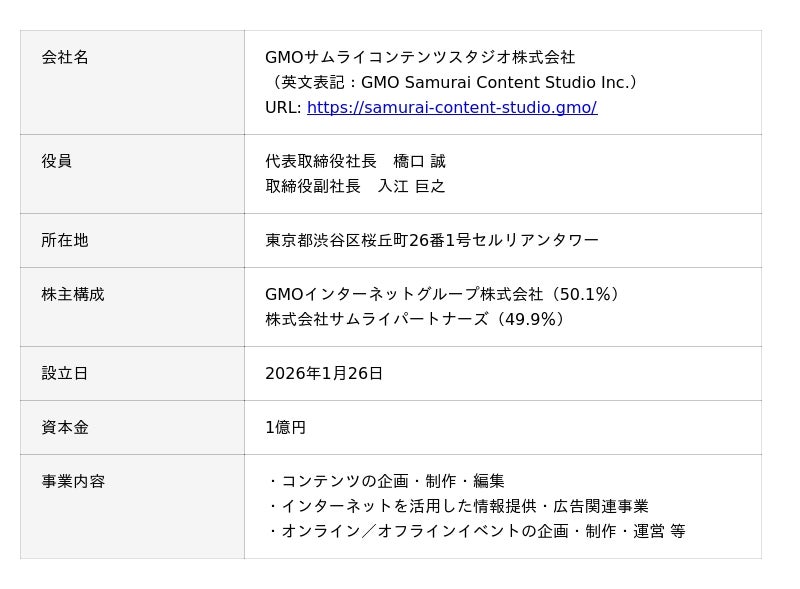 GMOインターネットグループとサムライパートナーズ、合弁会社「GMOサムライコンテンツスタジオ株式会社」を設立