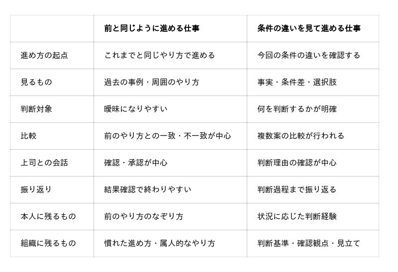 - 過去のやり方を参考にしつつ、今回の条件の違いを確認する- 何を判断対象として扱うかが明確になっている- 必要な事実確認や比較観点がある- 上司との会話は、「なぜそう考えたか」の確認が中心になる- 結果を次回の判断基準の見直し材料として扱う- 経験が、作業で終わらず判断経験として蓄積されやすい