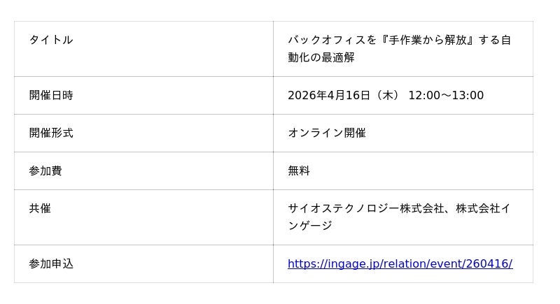 コミュニケーションプラットフォ-ム「Re:lation(リレーション)」を提供し、6,000社以上(※1)の導入実績を誇る株式会社インゲージ(本社:大阪府大阪市、代表取締役社長:和田 哲也、以下インゲージ)は、2026年4月16日(木)、サイオステクノロジー株式会社と共同で、バックオフィス業務の自動化をテーマにした無料ウェビナー「バックオフィスを『手作業から解放』する自動化の最適解」を開催することをお知らせいたします。
